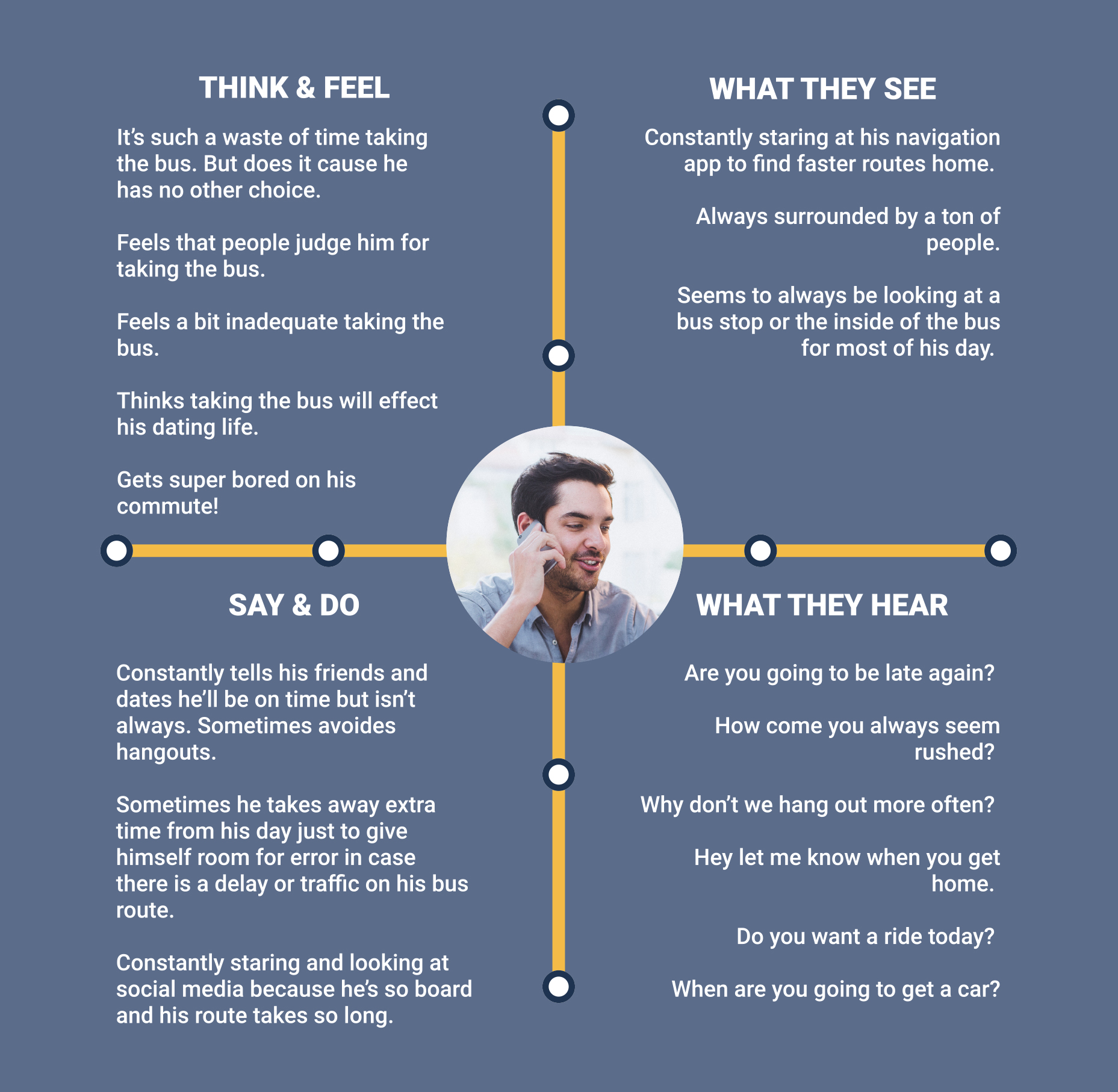 Once I had finalized and aggregated all my data from my survey. I developed an empathy map to set the tone of what it's like to ride the bus in daily commutes.