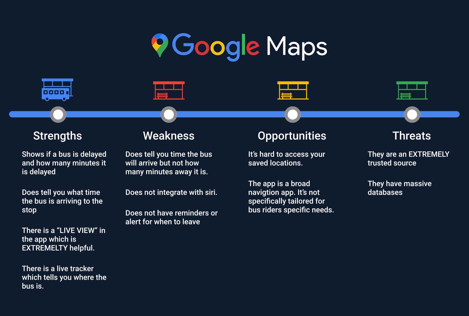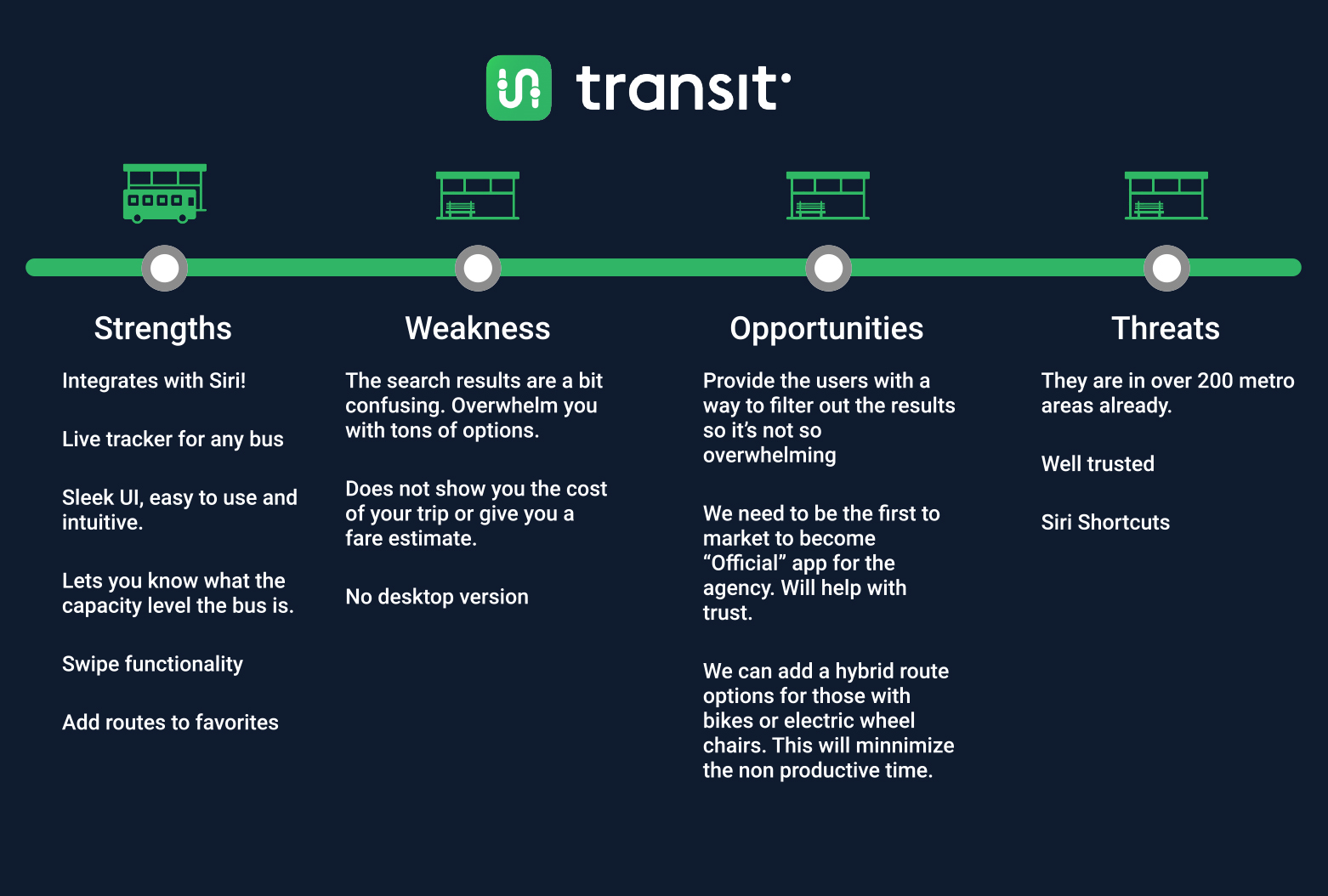 Once I had defined the problem, one thing that was made clear during my research was that an overwhelming amount of survey responders indicated they used Google Maps during their daily commutes on the bus. A whopping 90% of the survey responses laid claim to using Google Maps. The runner up was Citymapper at 10%. However, when deciding what apps to conduct a competitive analysis for, the TRANSIT app caught my attention mostly because they had live tracking as part of their experience. Something that Google Maps did not. Plus, they grew popular in the midwest and were awarded several prestigious design awards by Apple and Google.