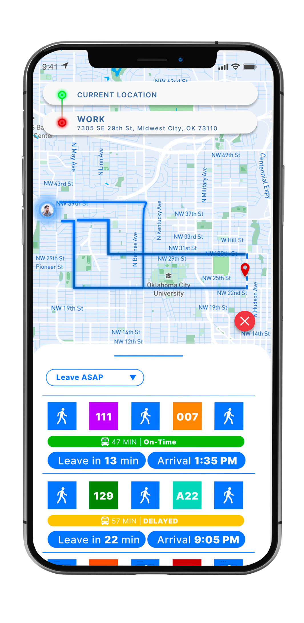 The idea behind the route option screen was for the user to make a fast and informed decision about what route to take regardless if they were traveling to a new destination or a frequently visited place like their work. Since many bus commuters face a lot of stress and anxiety when taking the bus, I wanted to make it easy for the user to get fast and visual confirmation if: