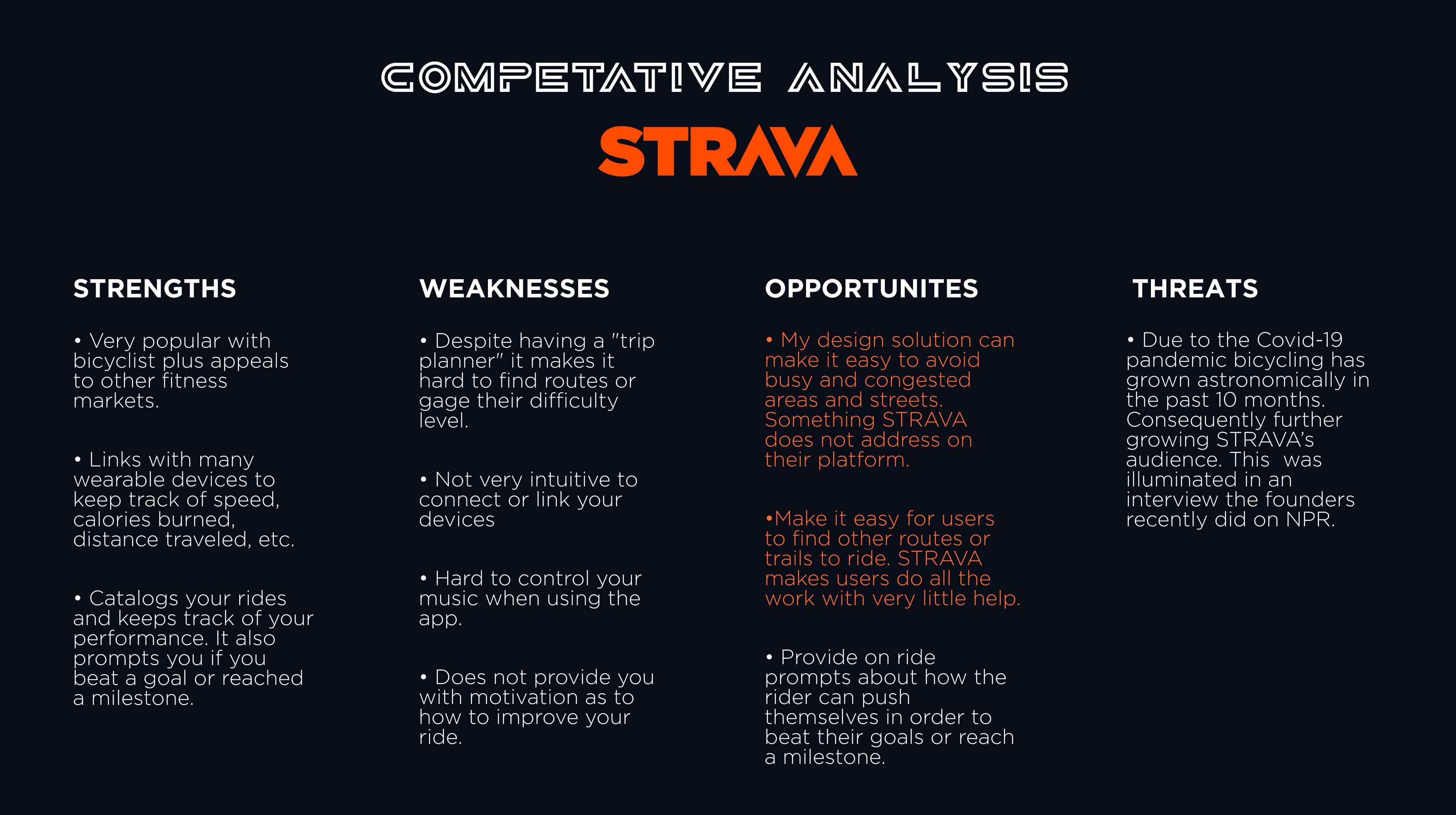 As part of my Thinkful Capstone project, my goal was to create an app that would appeal to cyclists who primarily ride their bikes to stay in shape or lose weight. To challenge myself, I decided to strategically create a product that would be a direct competitor to STRAVA. A fitness app that currently dominates the market and immensely caters to people who are avid cyclists.