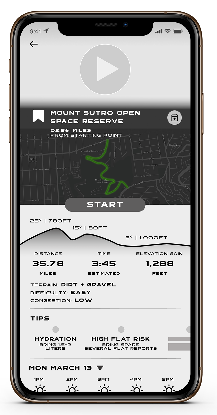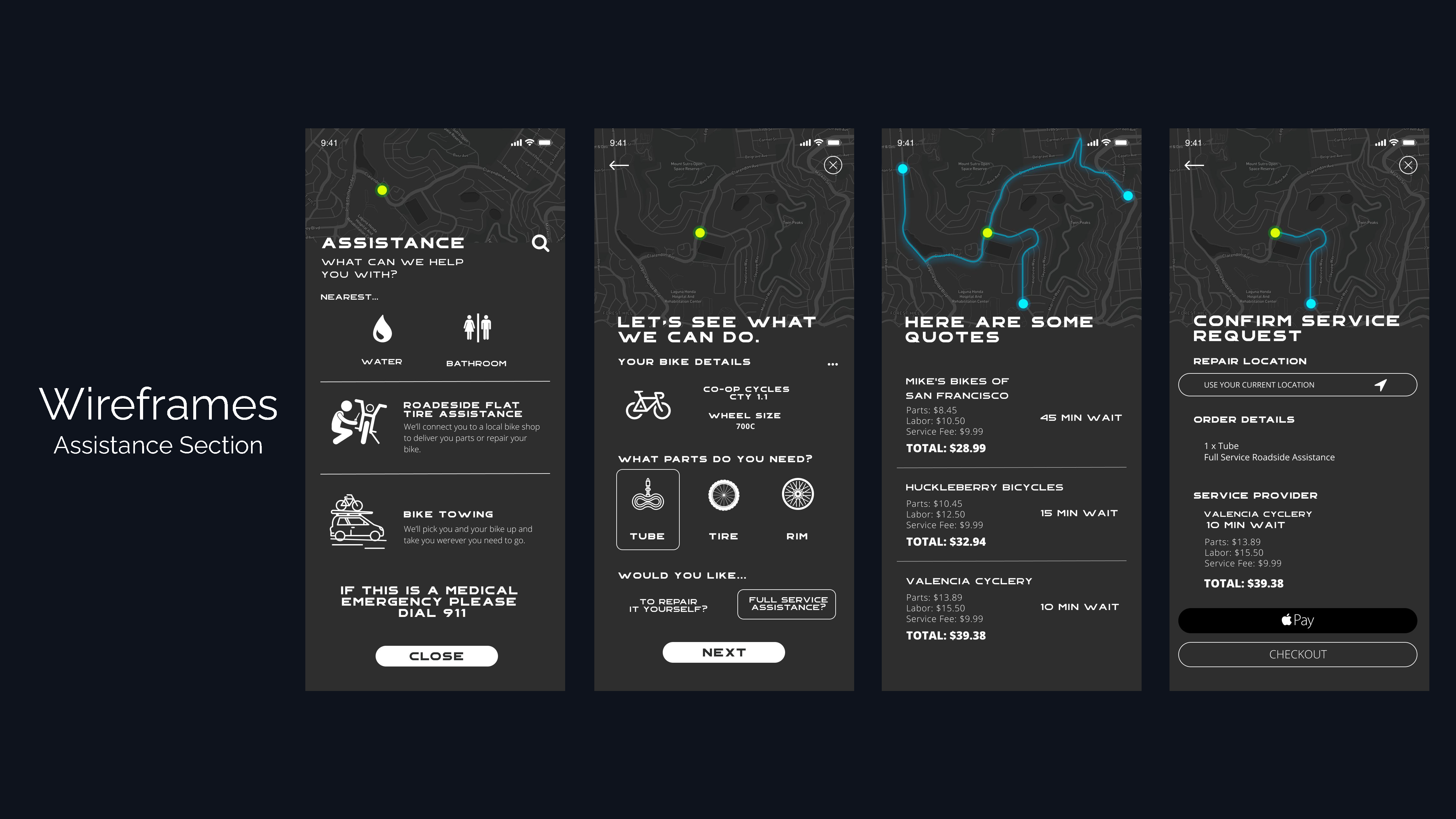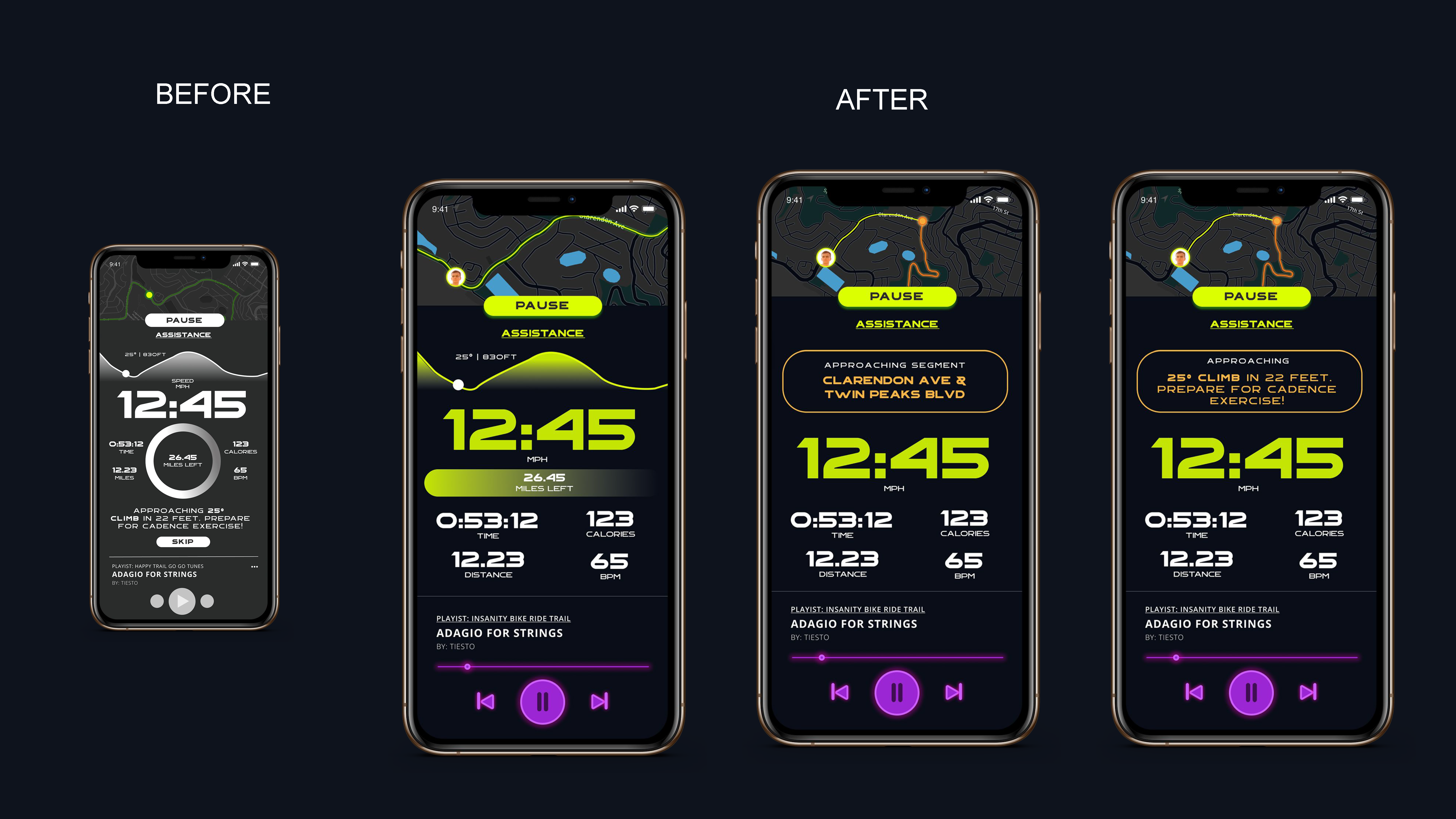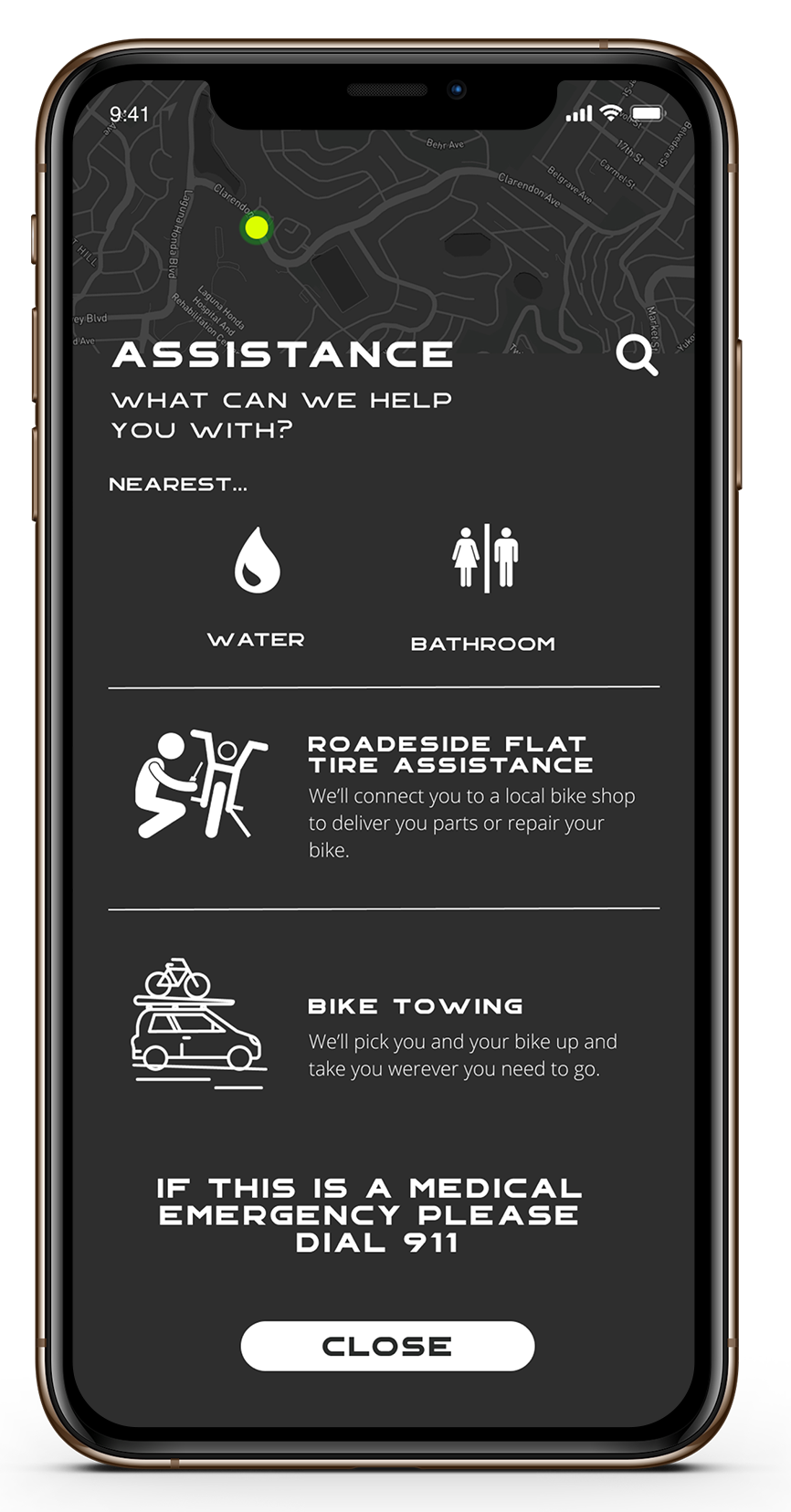 Through extensive research and usability testing, I created an app that helps cyclists set fitness goals and plan out their rides. It also allows riders to be well informed about weather and route conditions to avoid unpleasant situations. As part of my solution, I created an immersive cadence experience of audio, touch, sound, and sight to help rides stay motivated when climbing on their rides. Lastly, drawing inspiration from AAA and UBER/Lyft type services. I designed an "assistance" section that connects riders to local bike shops to receive roadside assistance if they experience a flat tire. The concept also allows a cyclist to get connected to drivers who can transport them and their bike home should they need to cut their ride short for whatever reason.