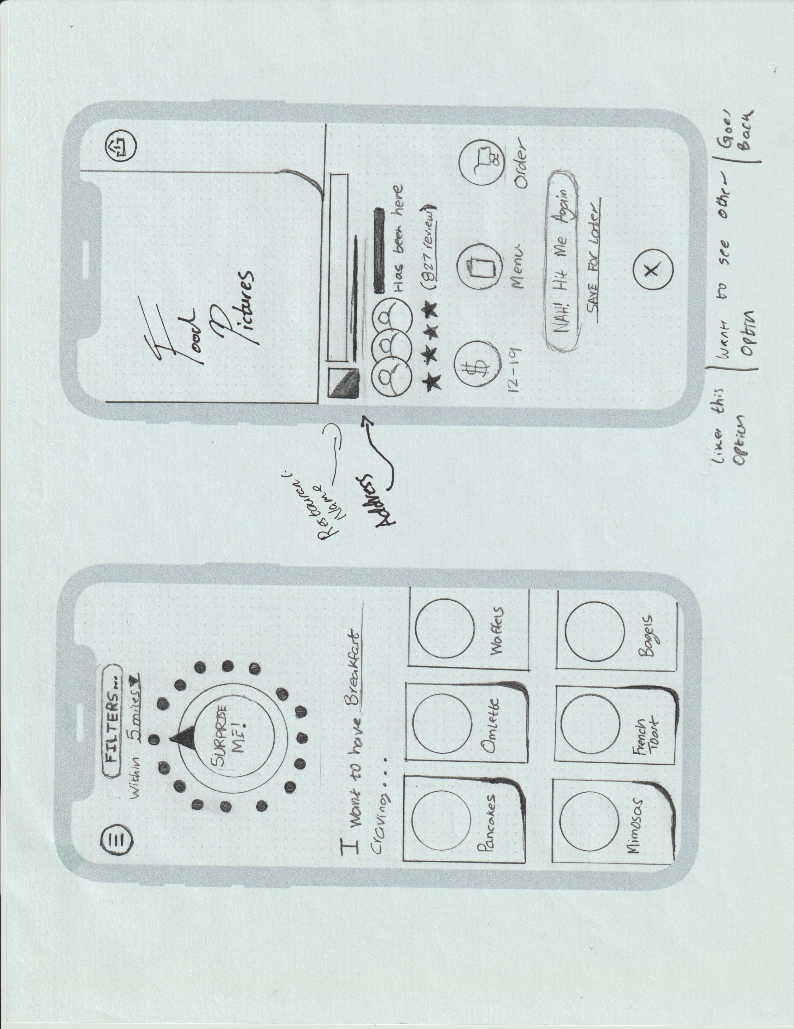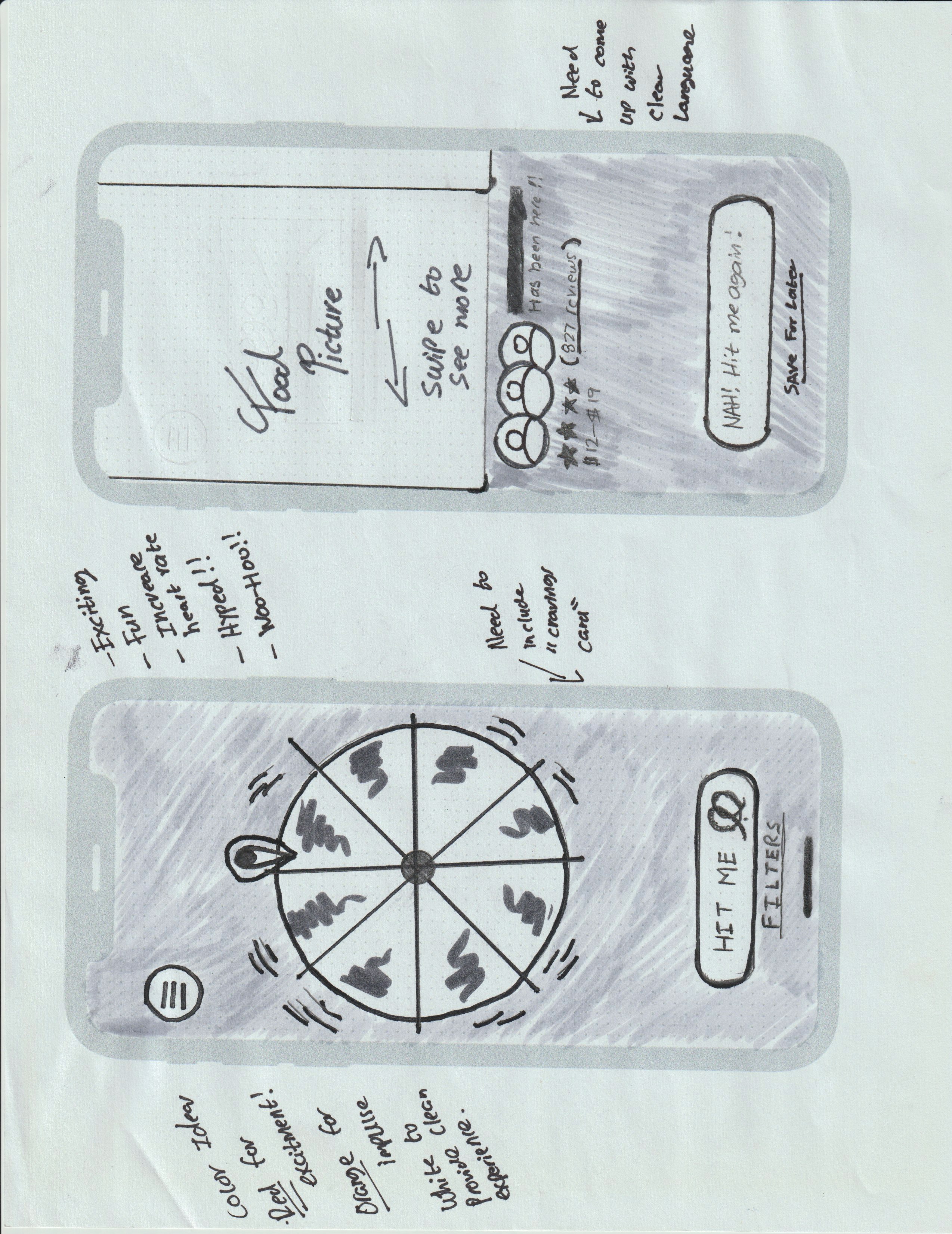 The first sketch design idea was simple. The app would comprise of a straight forward "fun" wheel where a user can spin it and be given a random restaurant recommendation. When getting feedback from client and others it seemed like a good start. However, many people brought up that it only solved one singular use case and that they wished that it had some more robust options to explore places to eat.